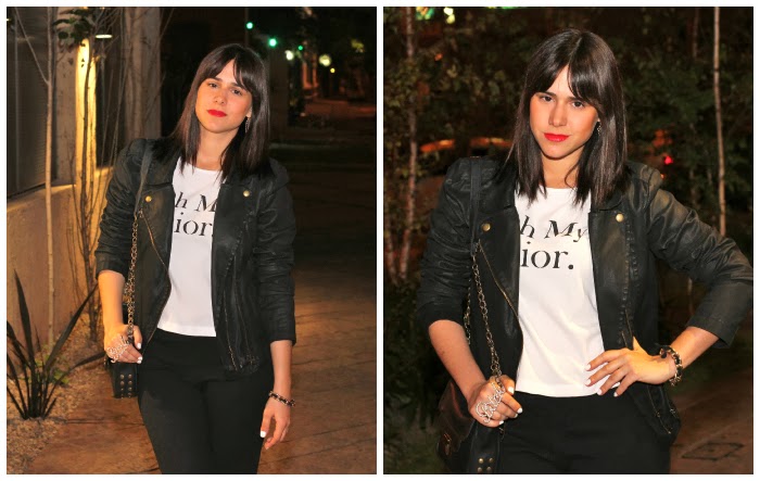 Hoy les muestro un outfit que usé para salir el fin de semana. Me encantan los pantalones oxford para usar de noche, son increíbles! Lo complementé con remera blanca, zapatos rojos y chaqueta motoquera. Esta vez usé accesorios en dorado, para participar por unos similares, chequeá abajo!