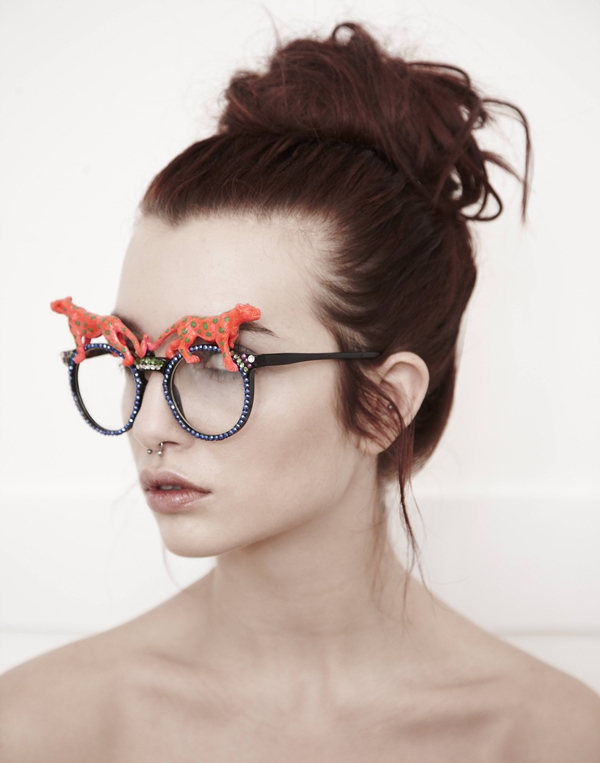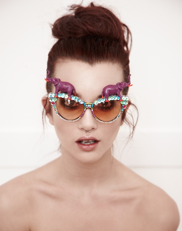 Lentejuelas, brillos y figuras de dinosaurios y elefantes decoran los marcos de estos originales anteojos.