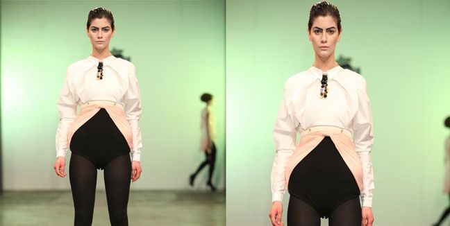 El desfile de Giacobbe fue inspirado en el funeral de Eva Perón. Muchos pantalones de tiro alto y chaquetas en la triada de colores negro, blanco y rosa.