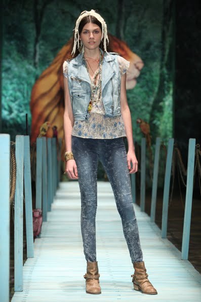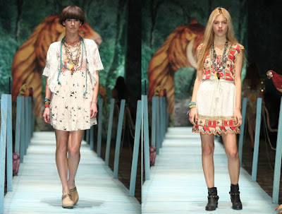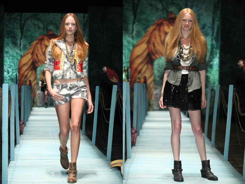 Urban Safari: Mucho mas femenino. Bonotones y bordados en chaquetas militares y sweaters tejidos. Se destacan los zuecos, carteras con flecos, chalecos y botas con tachas.