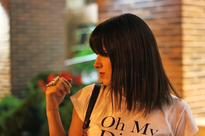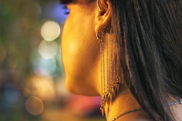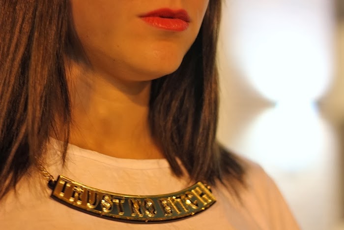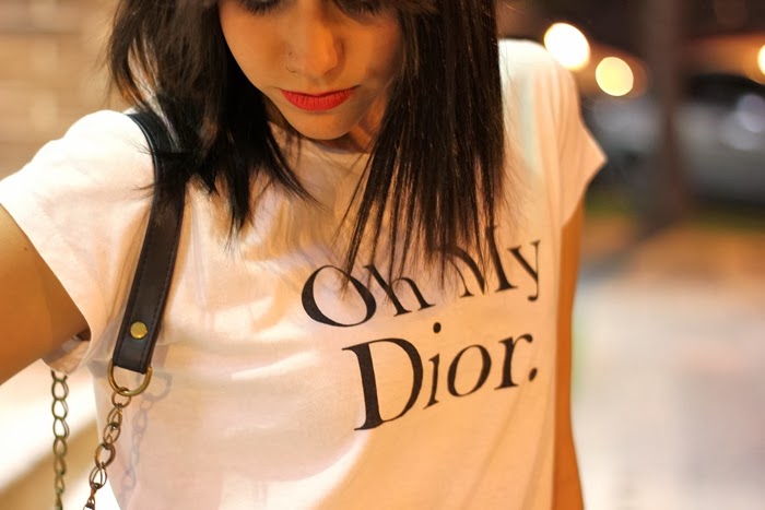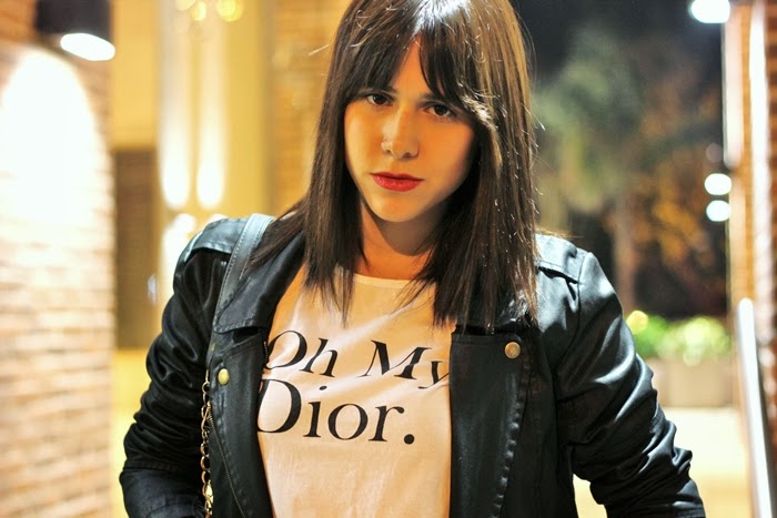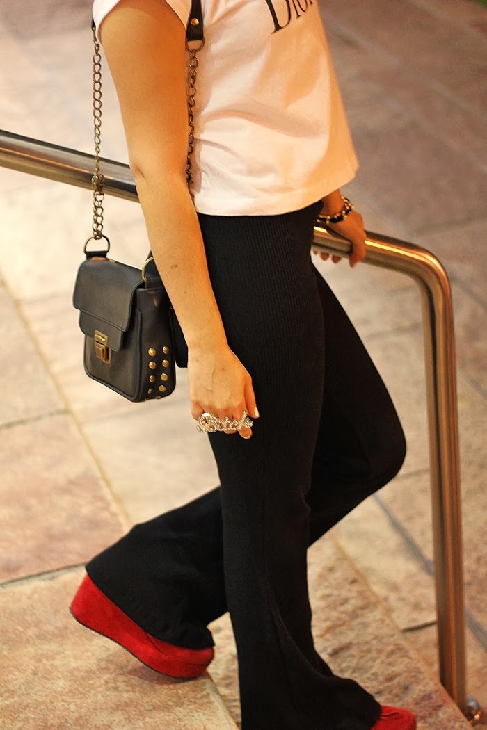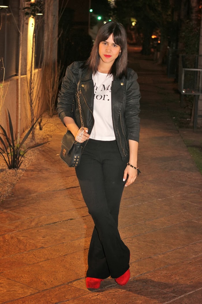 Hoy les muestro un outfit que usé para salir el fin de semana. Me encantan los pantalones oxford para usar de noche, son increíbles! Lo complementé con remera blanca, zapatos rojos y chaqueta motoquera. Esta vez usé accesorios en dorado, para participar por unos similares, chequeá abajo!