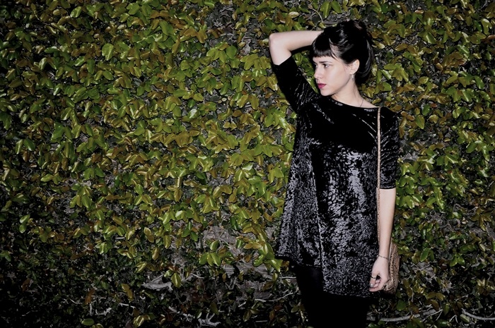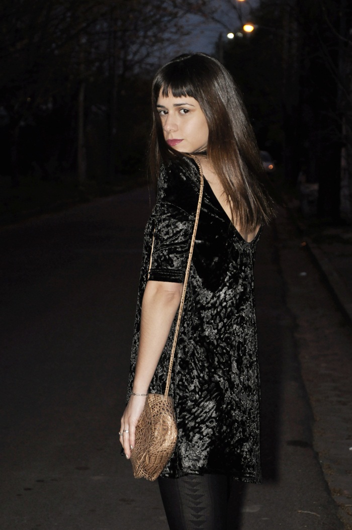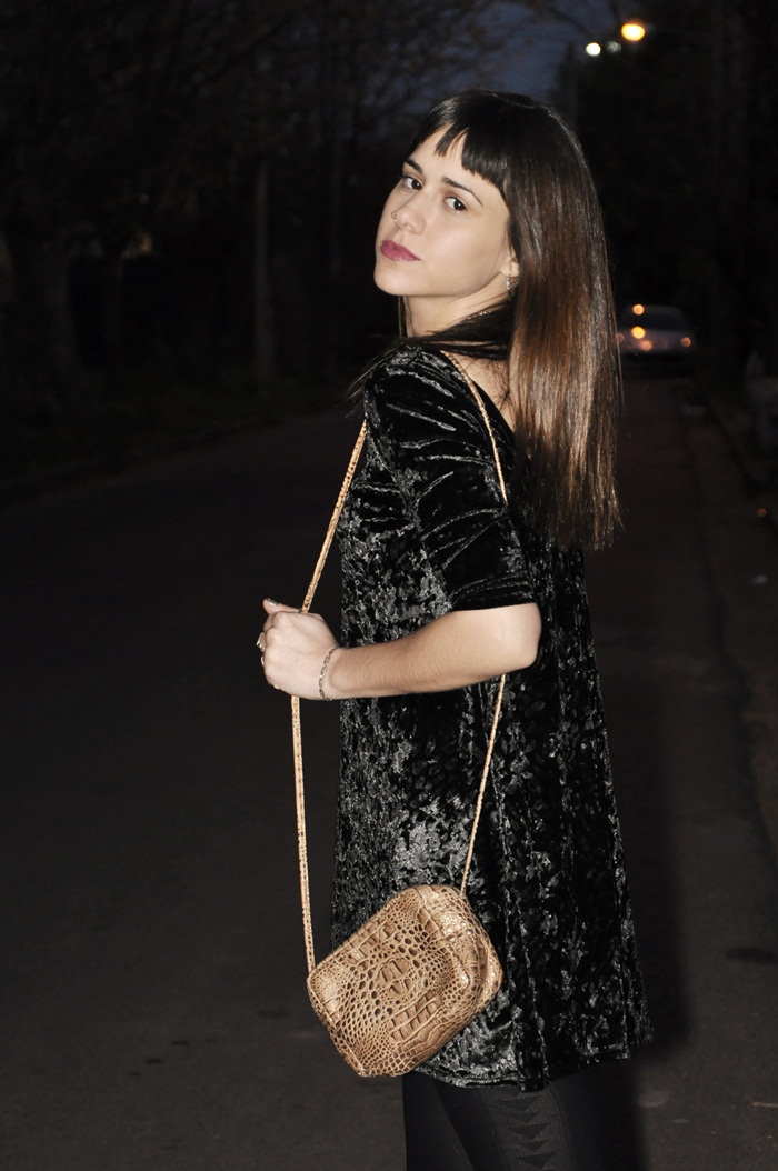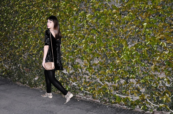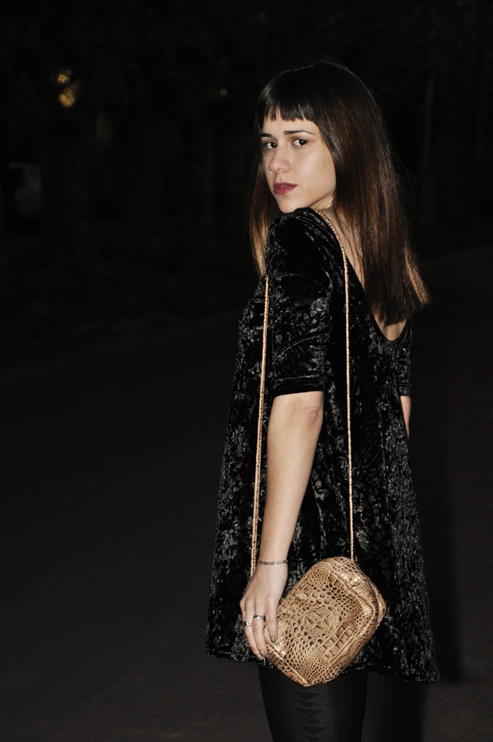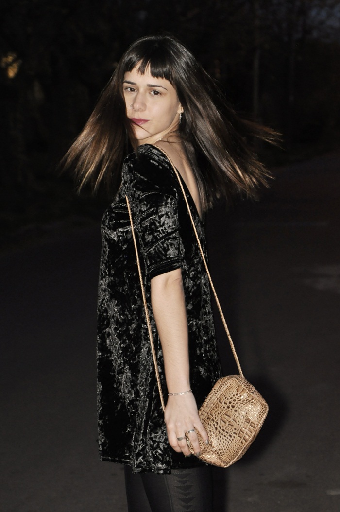 Hola! ¿cómo están? hoy les muestro un outfit nuevo con un vestido que me encantó usar durante toda la temporada. Es de terciopelo y tiene un corte A, que me fascina. No me gustan mucho los vestidos al cuerpo para salir de noche y este me queda comodísimo. Además, usé mis botinetas nuevas de reptil que son una bomba.