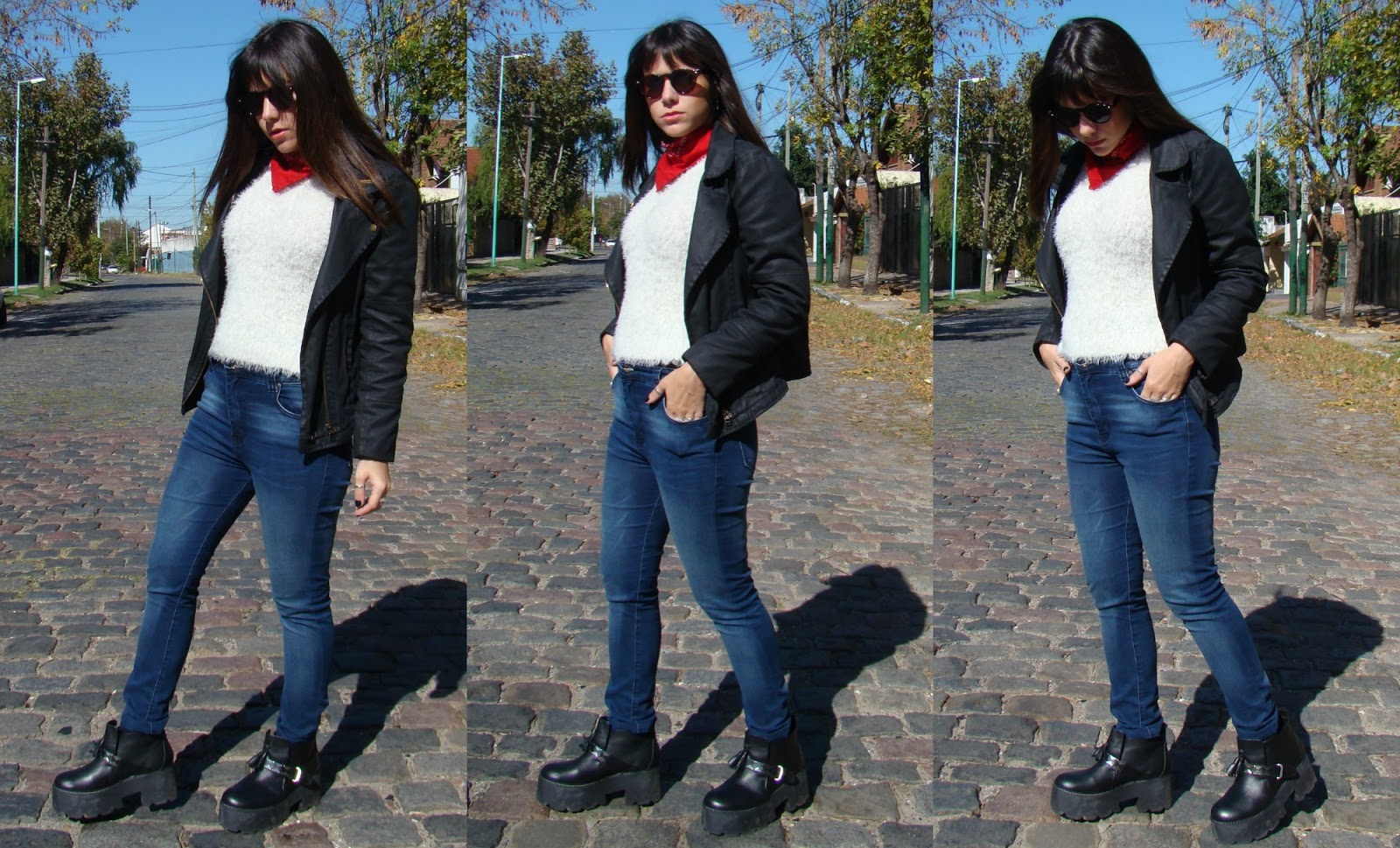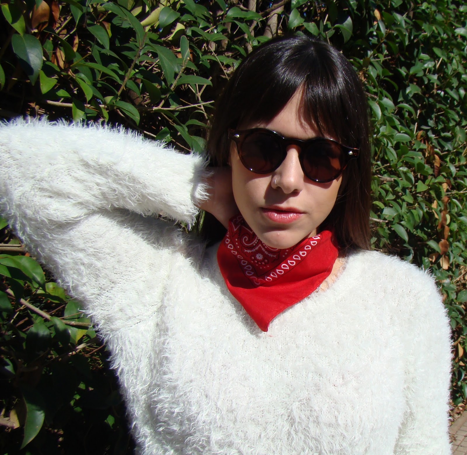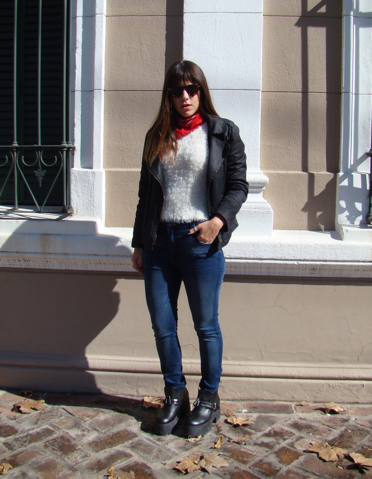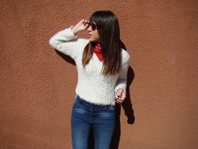 ¡Hola a todos! Luego de la «confesión» de ayer, hoy les muestro un outfit con una prenda que me encantó incorporar a mi vestidor: el sweater peludo. Es taaaan calentito que pienso usarlo en los días más helados. Lo combiné con una chaqueta de gabardina, jeans y botas. Como accesorios, elegí anteojos de marco redondo y un pañuelo comodín que amo.