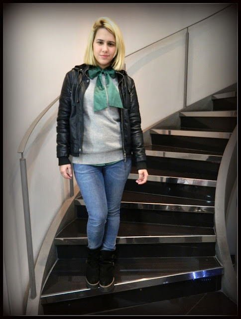 Opté por usar una camisa con lazo para estos últimos días de frío! La campera de cuero: infaltable.