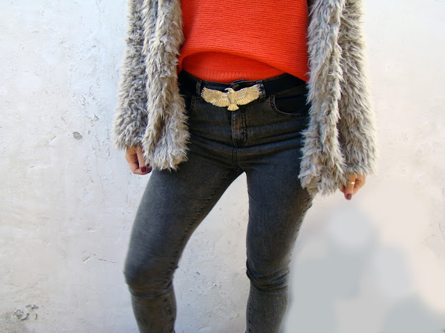 Además, un abrigo de pelo de María Francesca híper liviano. Lo combiné con jeans de tiro alto, un cinturón con hebilla protagonista de la misma marca y zapatillas.