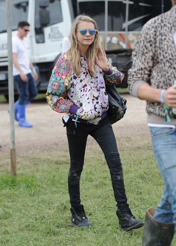 | CARA DELEVINGNE CON UNA BOMBER JACKET Y BOTAS DE TIMBERLAND. |