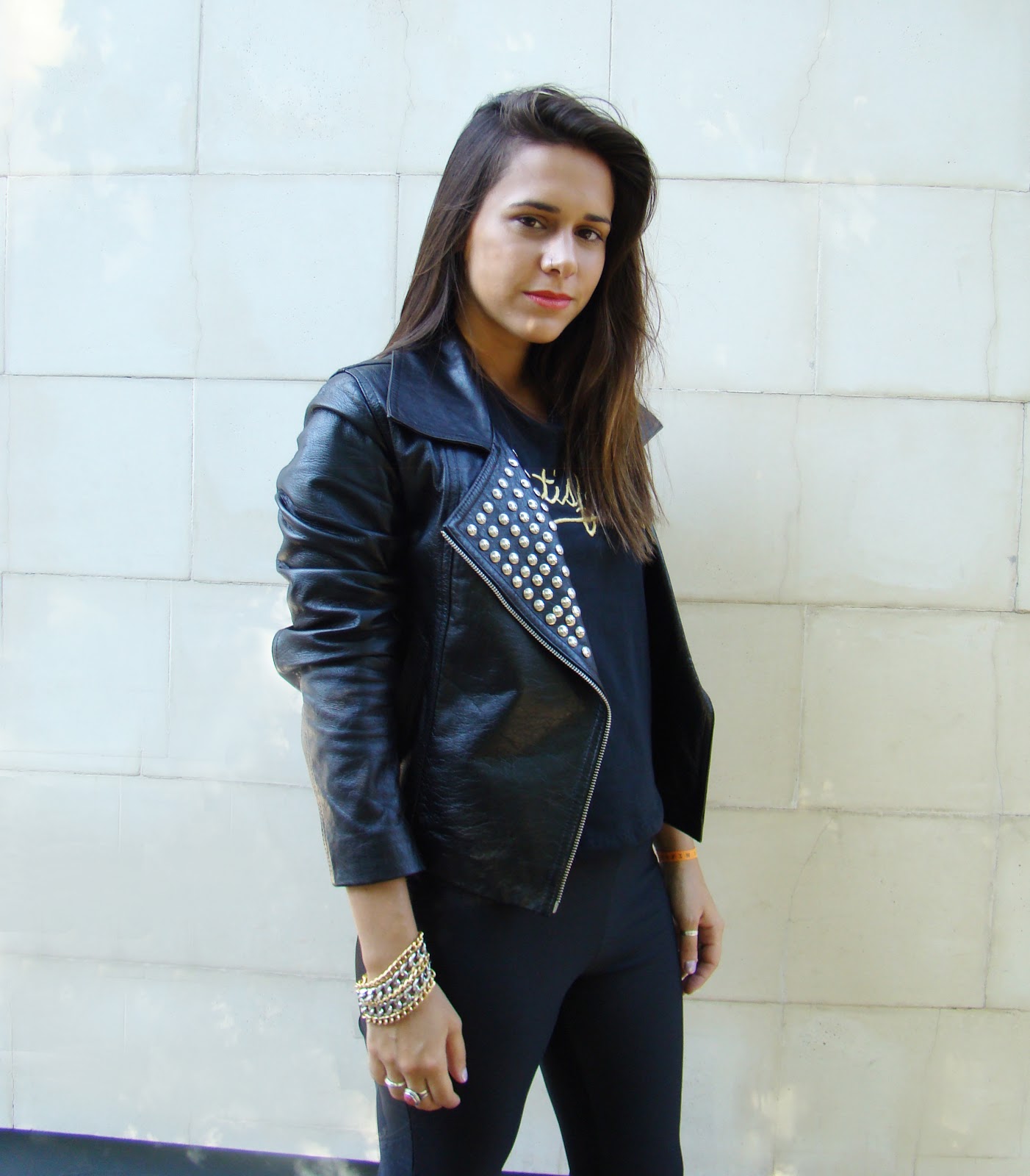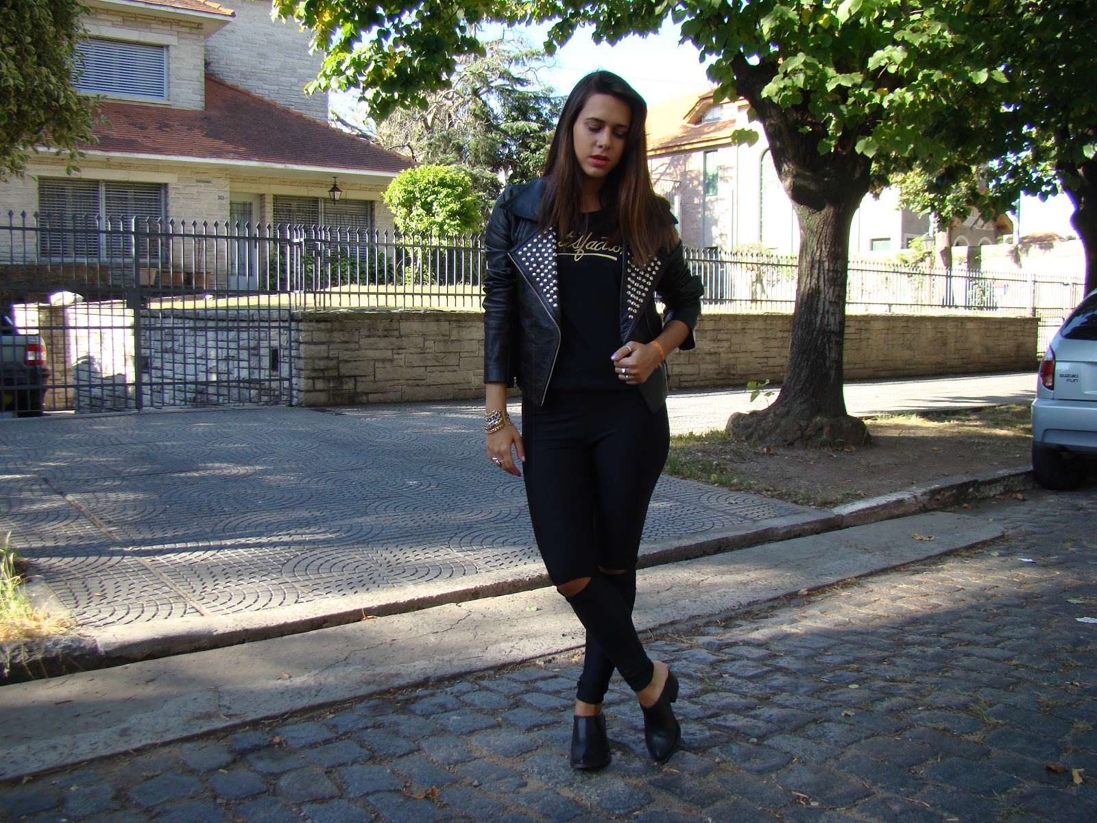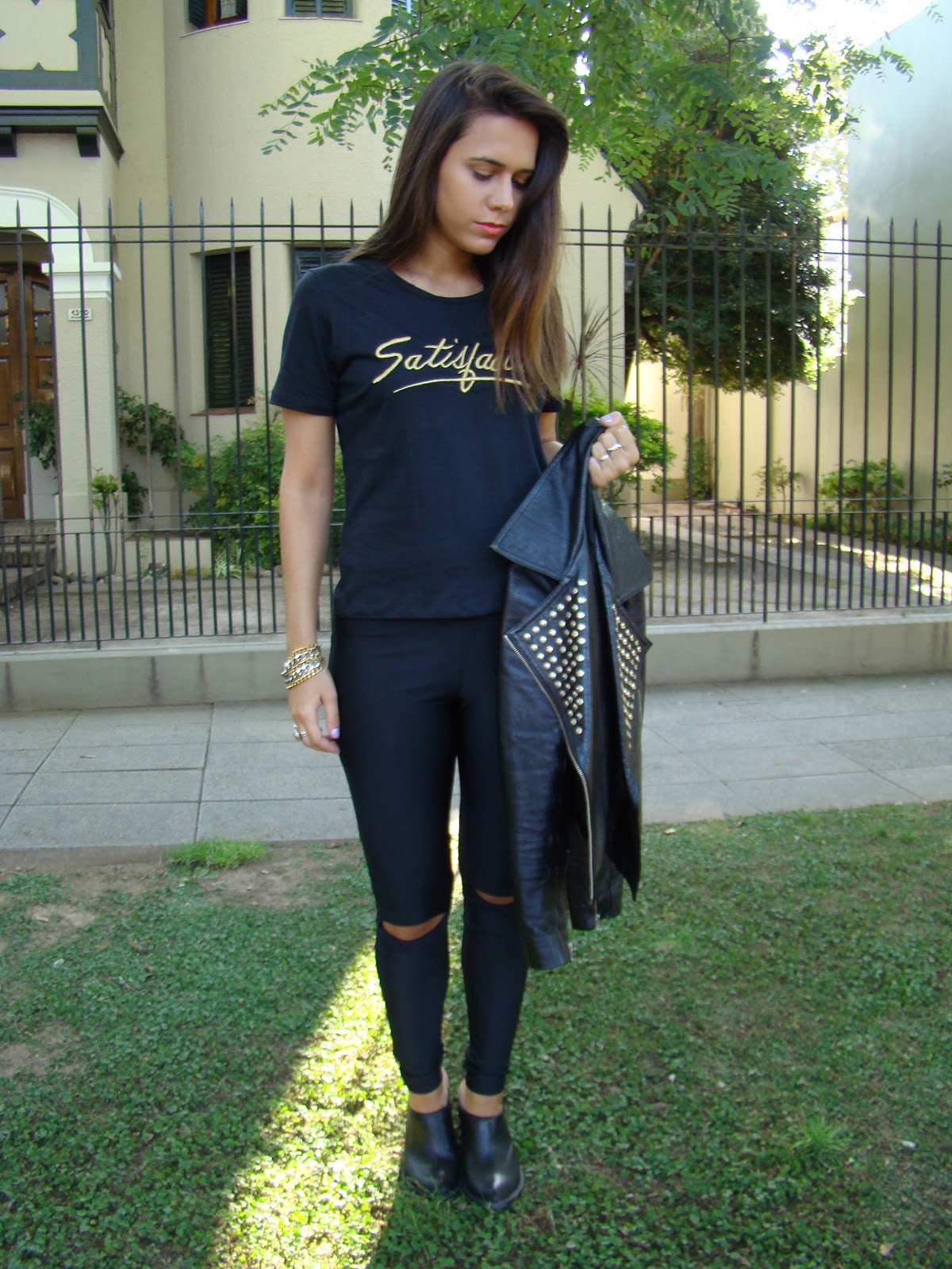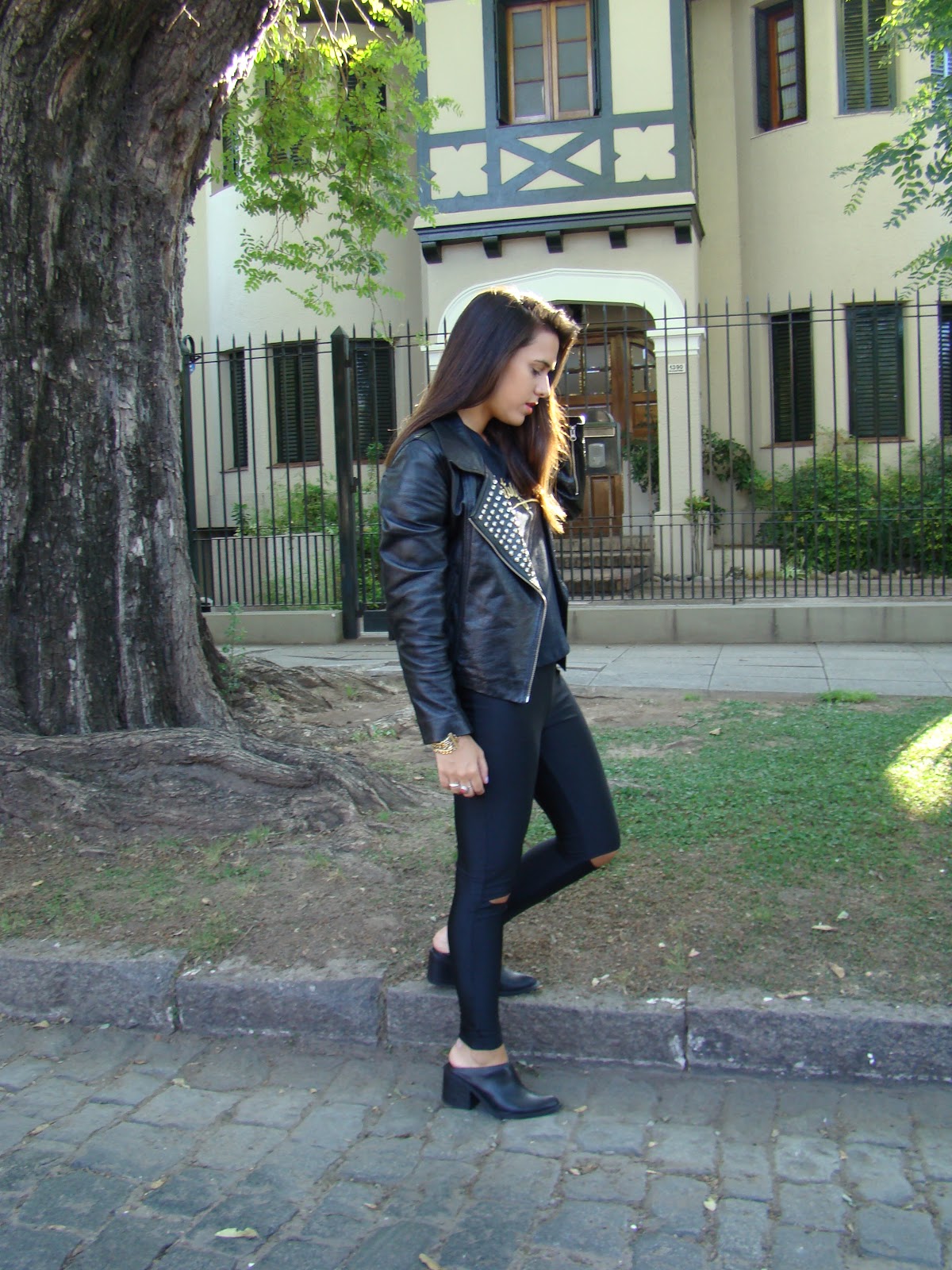 Las combiné con una chaqueta de cuero con tachas y botas sin talón. Además, usé una remera bordada súper canchera con un bordado muy stone.