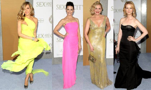 En la avant premiere de Japón, hermosas. Sarah luce un vestido floreado de la diseñadora Vivienne Westwood y zapatos de color nude. Davis (quien encarna a Charlotte) eligió un vestido corto de color amarillo de Christian Lacroix y Nixon optó por un vestido negro de Calvin Klein.