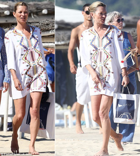 Kate Moss en St. Tropez con una camisola étnica y un sobre de Prada.