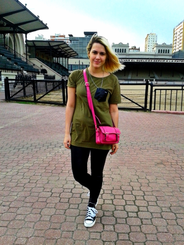 Elegí una remera verde militar con calzas símil cuero negras y zapatillas.