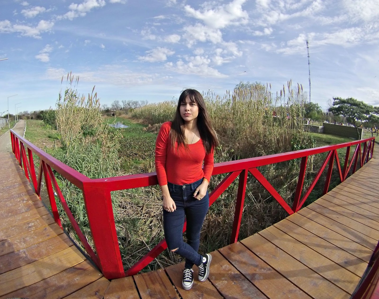 Además, usé una remera básica de Las Iulas en naranja fuerte, un tono del que me hice fan este invierno y un jean con roturas de tiro alto. Como accesorio estrené un collar (o casi pechera) muy boho.